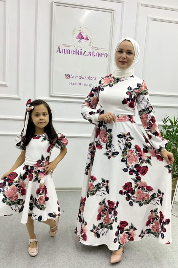 Çiçekli Anne Kız Kombin Elbise Beyaz
