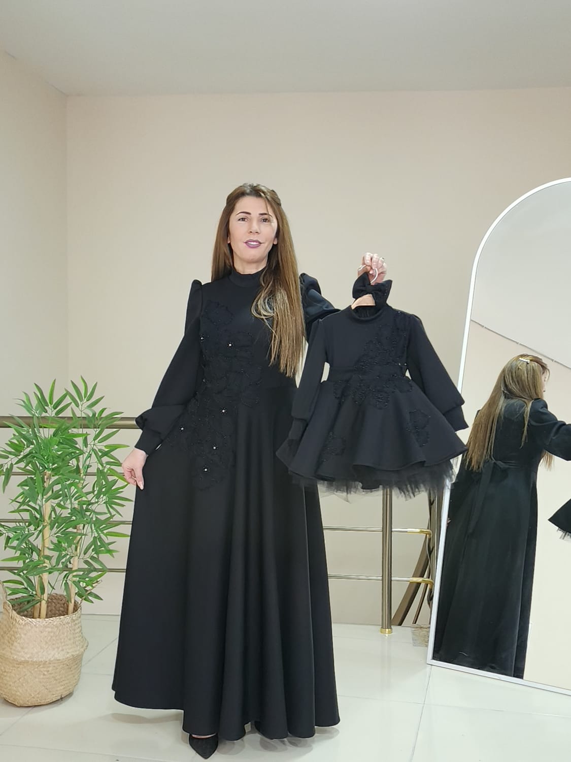 Editörün Notu: Siyahın asaletiyle buluşan bu tasarım, özellikle doğum günü çekimlerinde ve düğün organizasyonlarında anne-kız uyumunu en üst seviyeye taşımak isteyenler için idealdir.