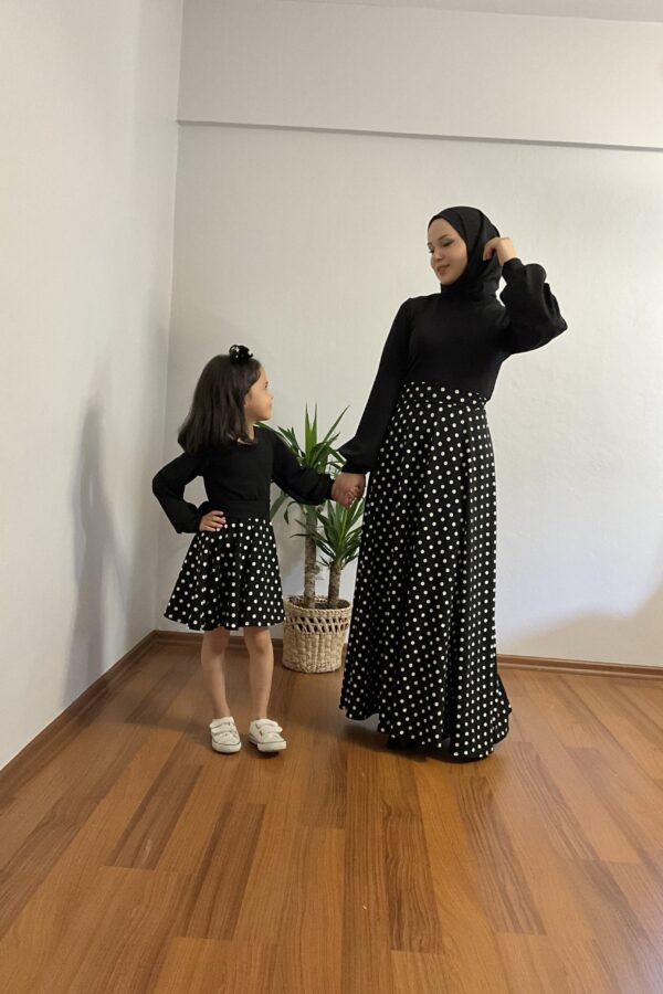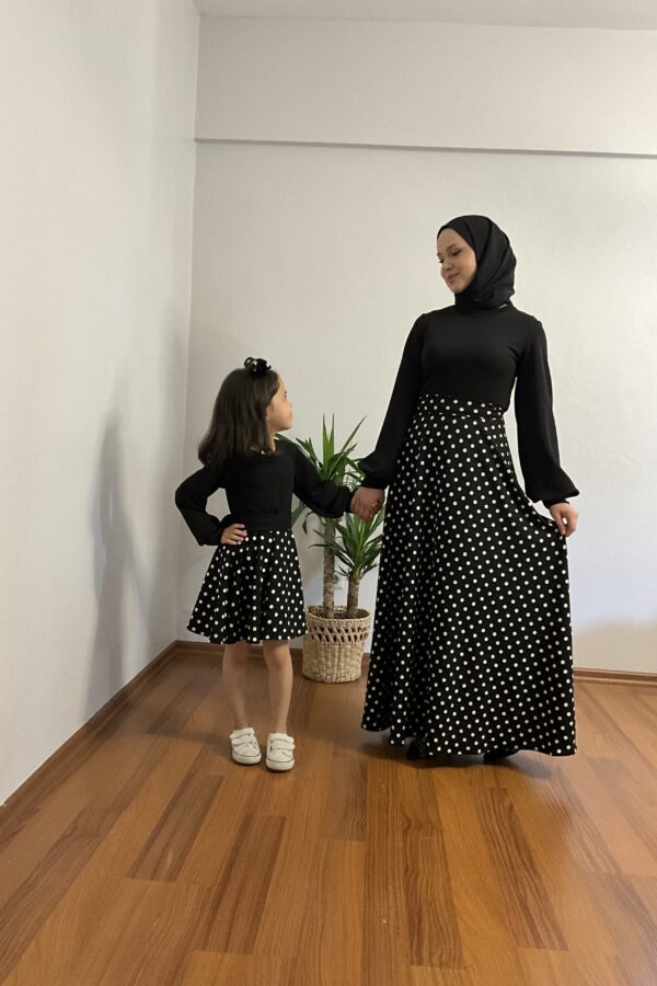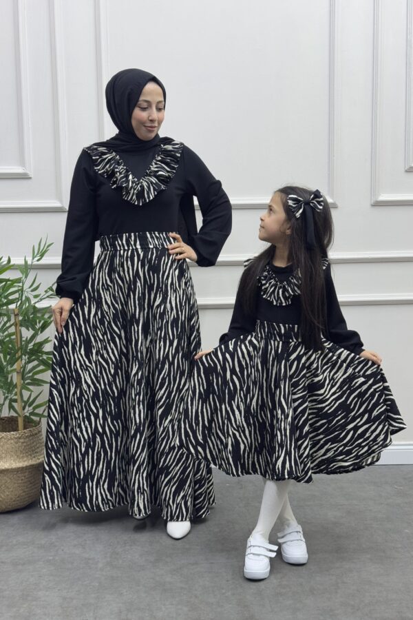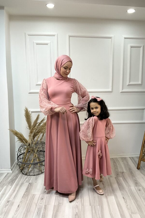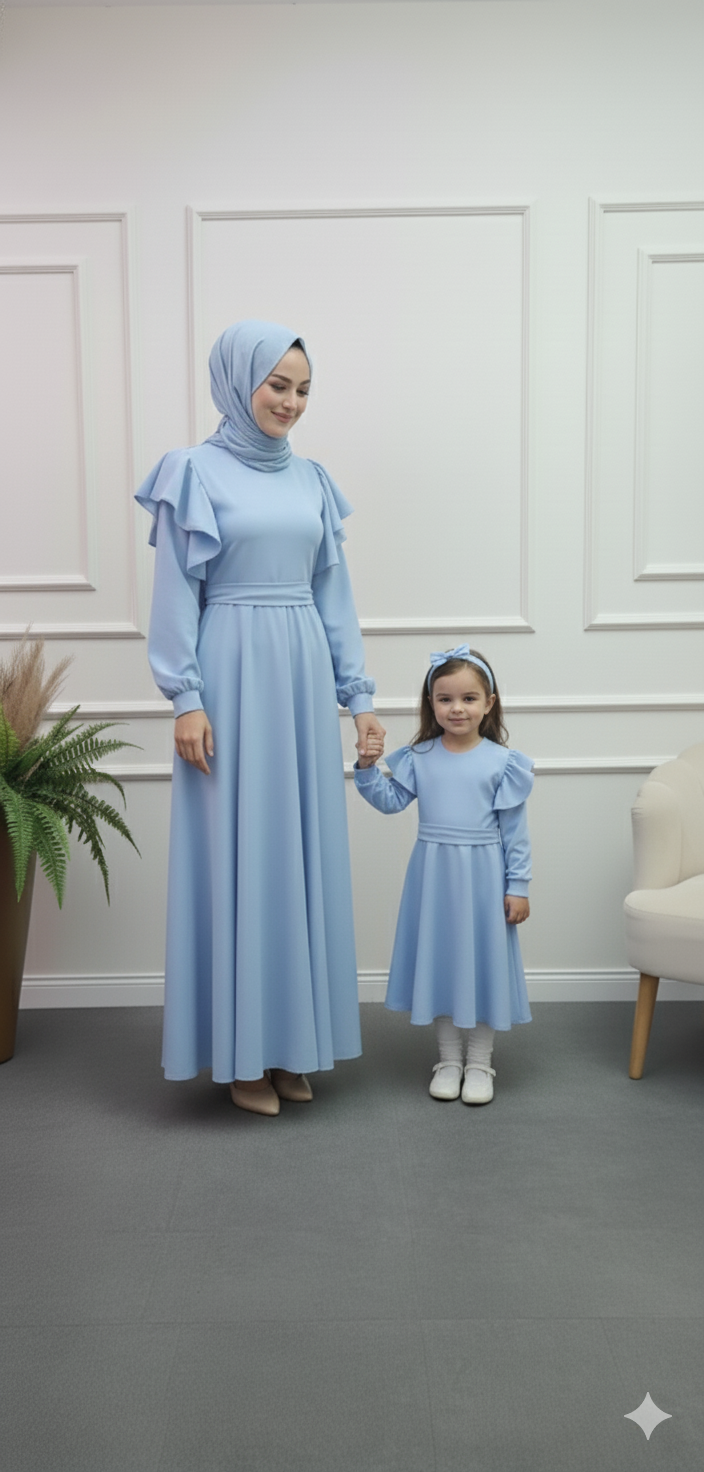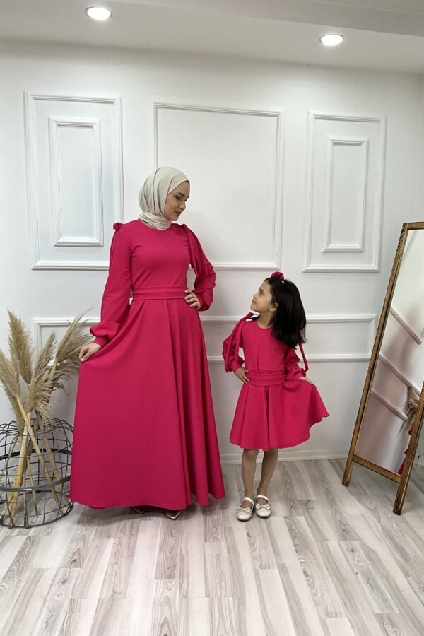 Anne kız kombin krep kumaş anne kloş model bol kol kol ucu manşet omuzu valonlu tak çıkart kemer detaylı çocuk kloş model uzun kol kol ucu manşet omuzu valonlu tak çıkart kemer ve toka detaylı