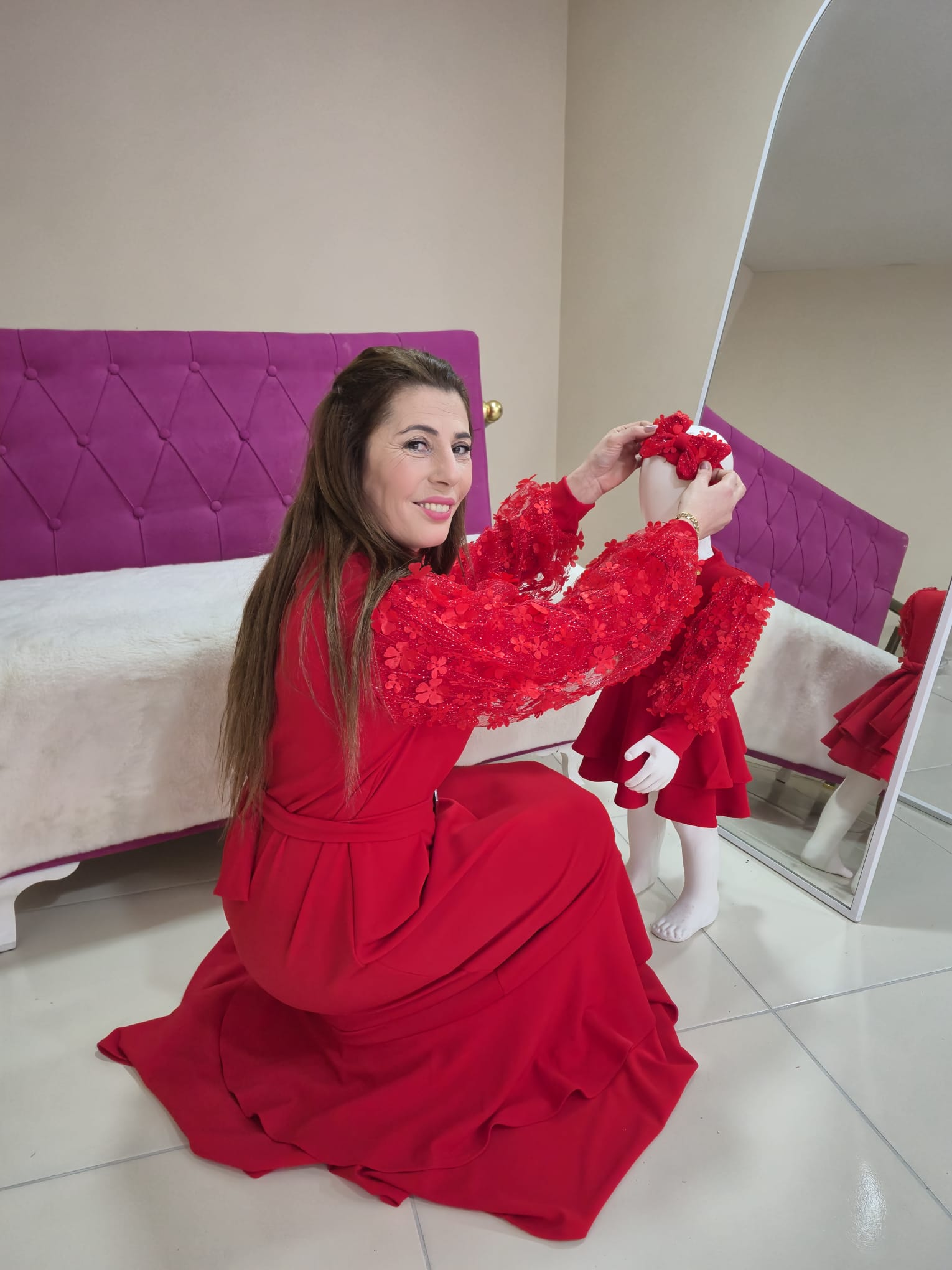 En özel davetlerde, düğünlerde ve doğum günü organizasyonlarında kızınızla birlikte gecenin yıldızı olmaya hazır mısınız? El işçiliği zarafetindeki kol çiçeği detayları ve göz alıcı renk seçenekleriyle bu kombin, masalsı bir şıklığı modern çizgilerle buluşturuyor.