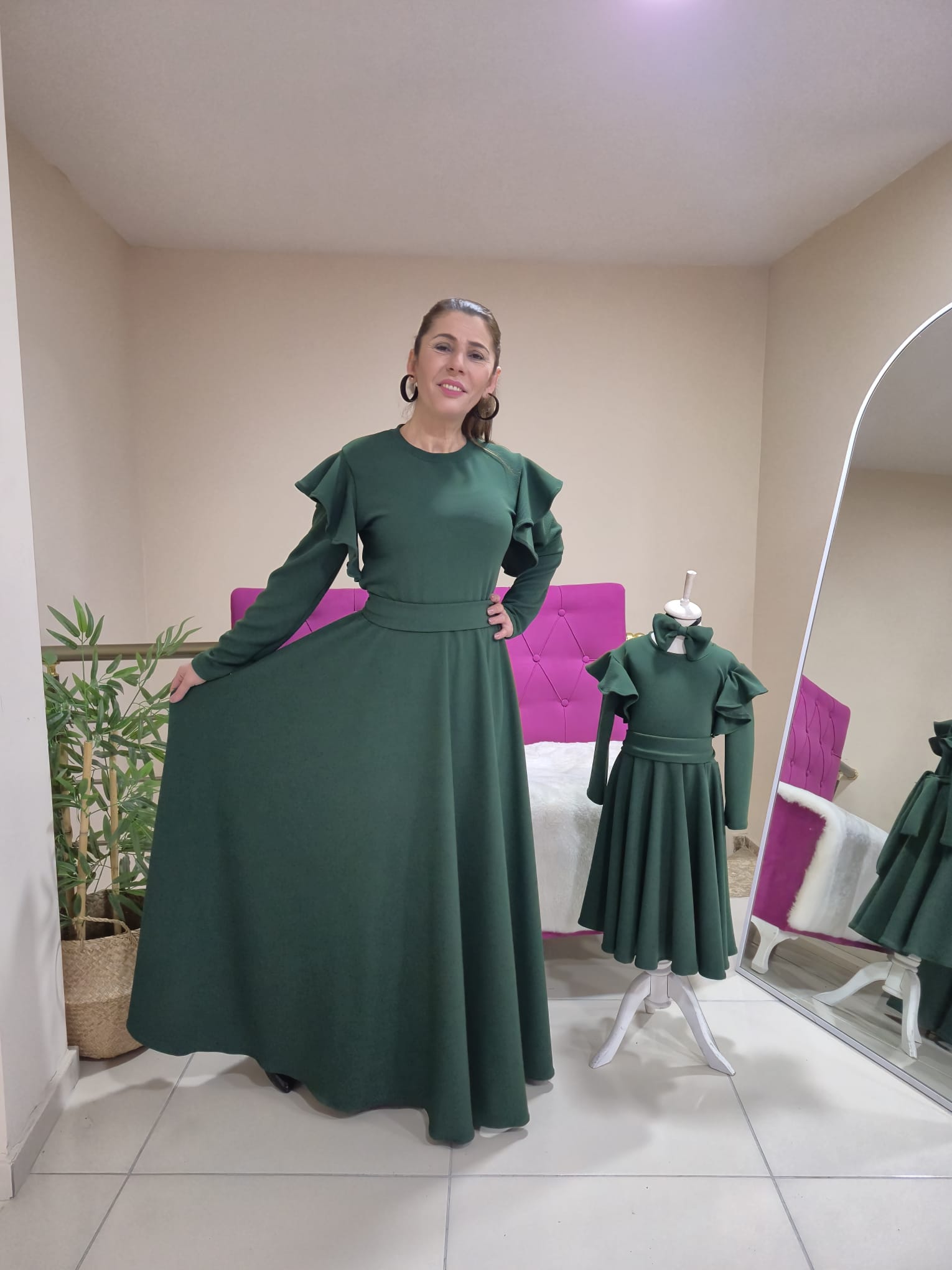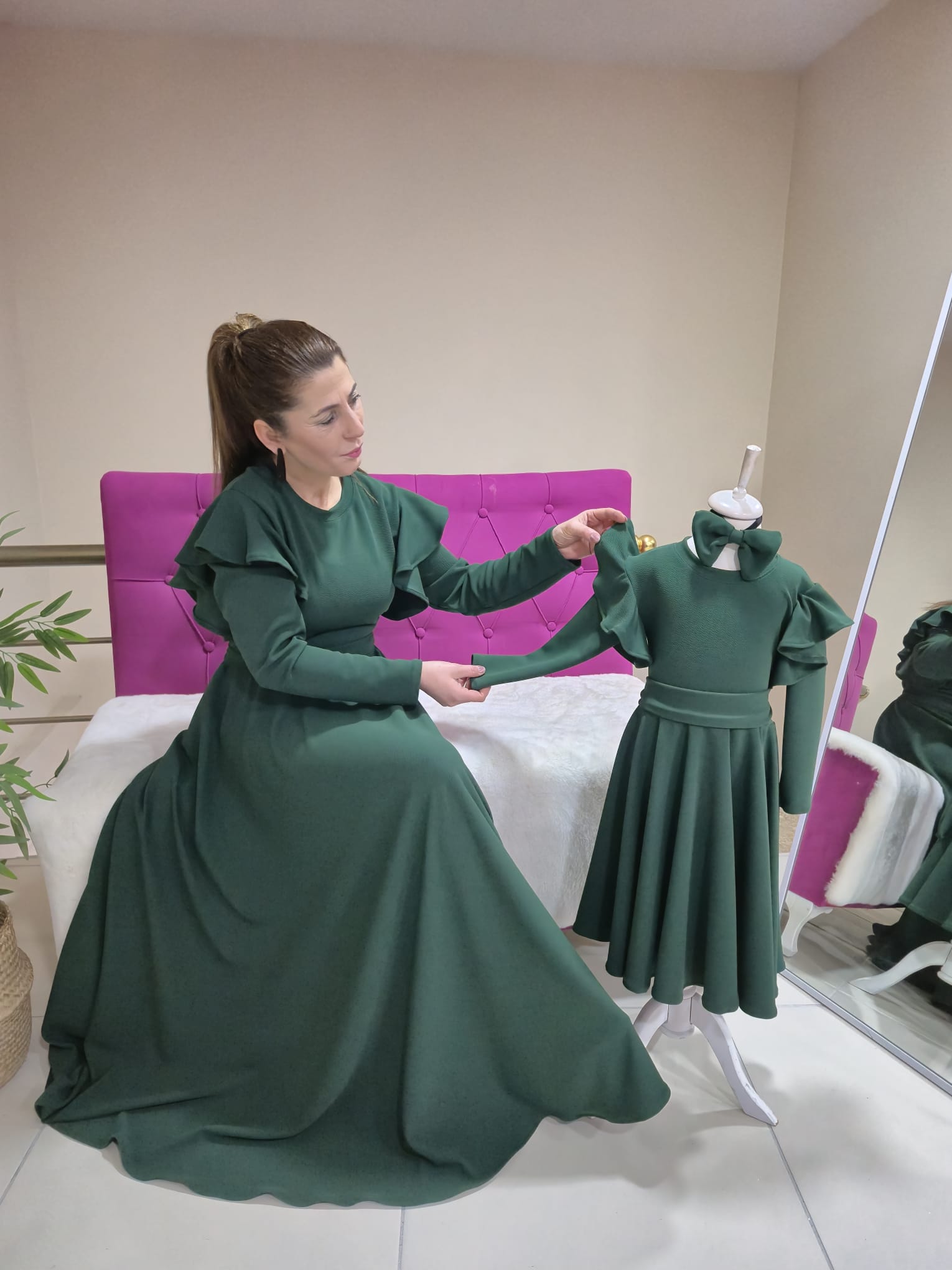 ZÜMRÜT Yeşili Fırfır Detaylı Krep Anne Kız Kombini