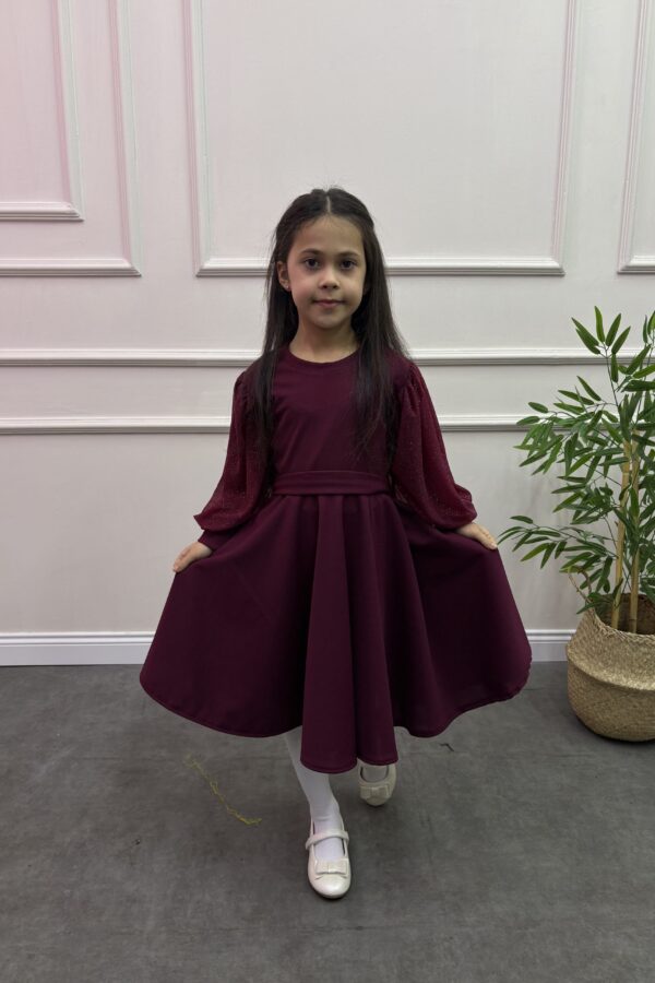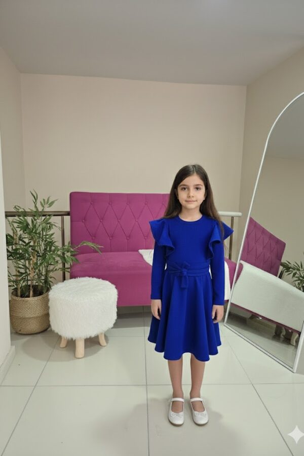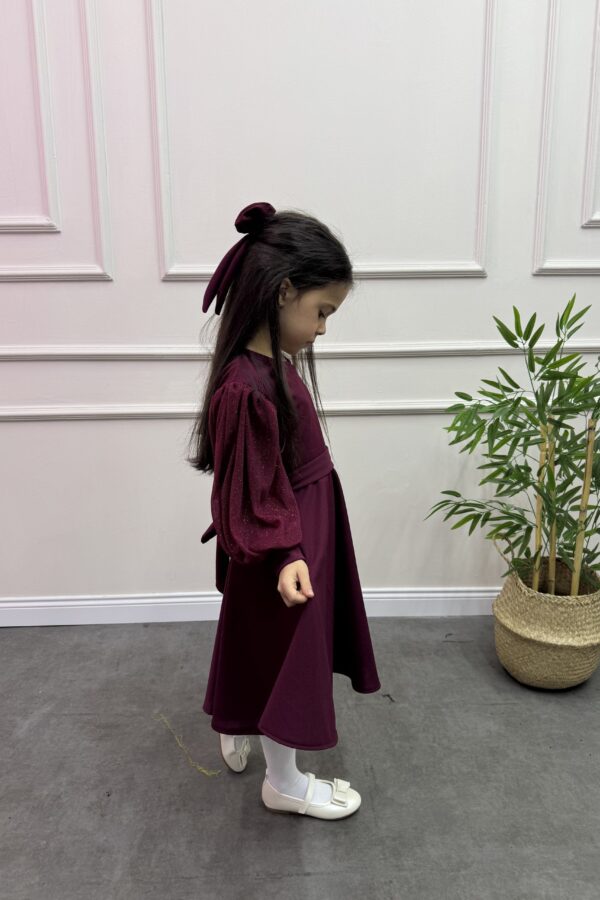 Çocuk krep kumaş eteği büzgülü  kısa kol üzeri fiyonk detaylı tak çıkart kemer ve toka detaylı