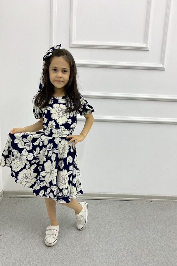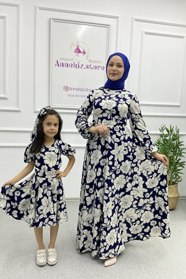 Çiçekli Anne Kız Kombin Elbise Lacivert