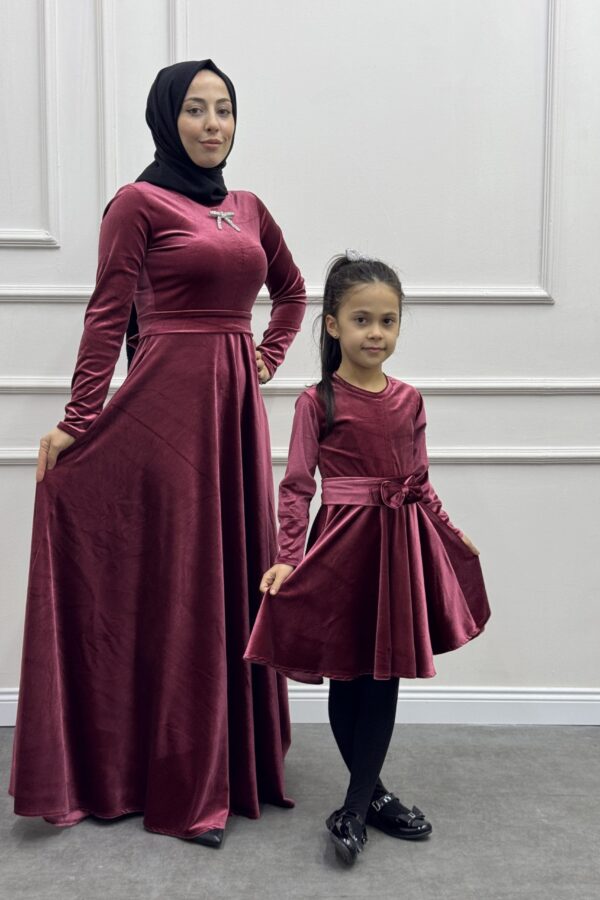 Simli Tül Anne Kız Kombin Elbise Bordo